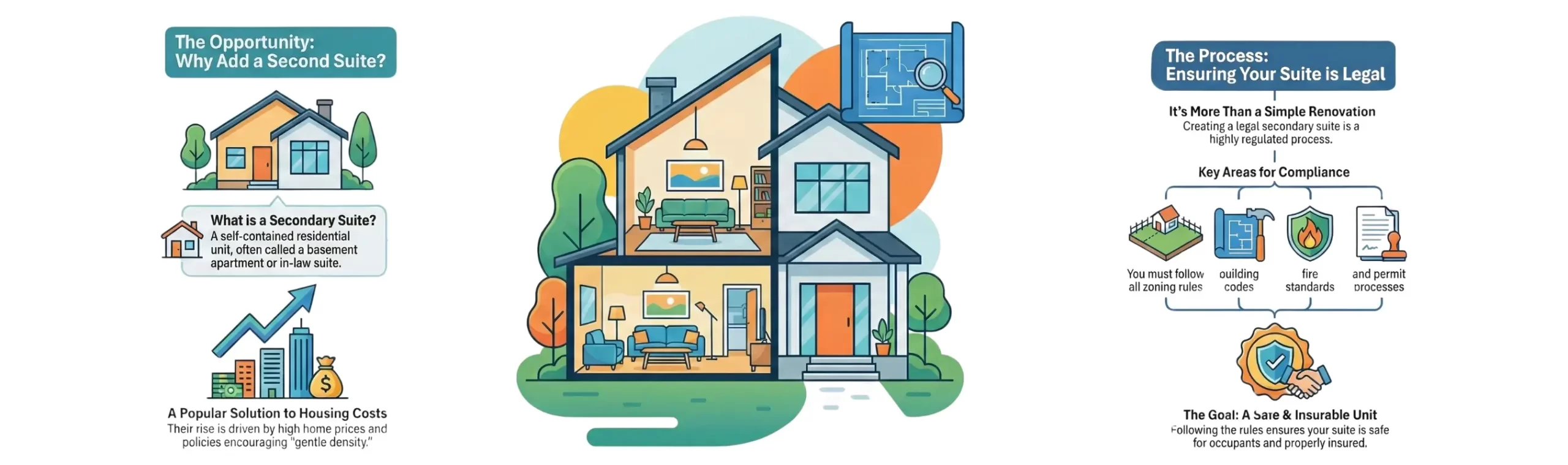 Secondary suites are one of the most effective ways to add value, income, and flexibility to a home – but they require careful planning, precise drawings, and full compliance with zoning and Building Code requirements.
