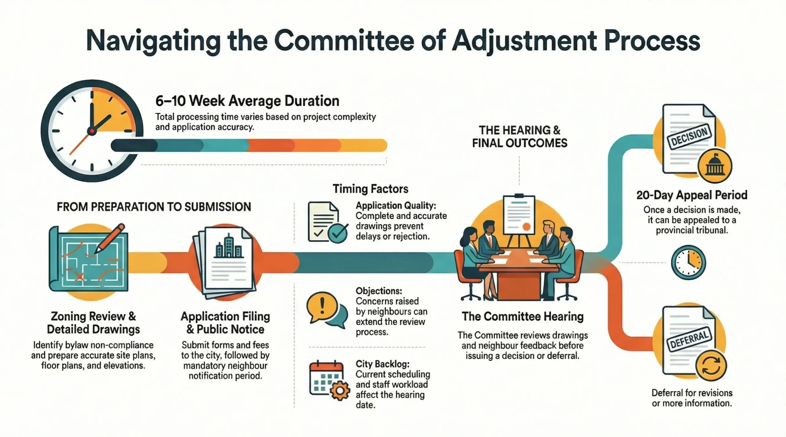 On average, the Committee of Adjustment process takes 6-10 weeks, but this can vary.